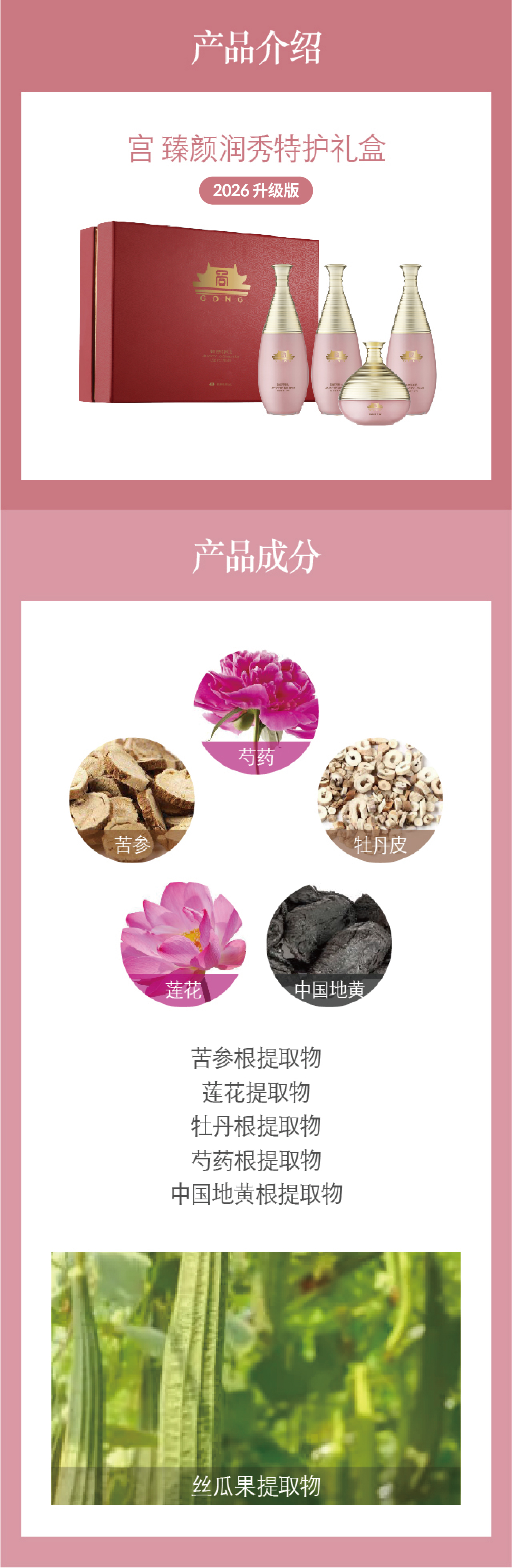 含有苦参根提取物、莲花提取物、牡丹根提取物、芍药根提取物、中国地黄根提取物、丝瓜果提取物等成分。